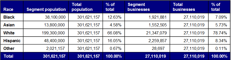 Looking at all US businesses doesn’t make things any better. I put together the table below which gives a breakout of US population and business stats from 2007 (the latest census info for businesses).